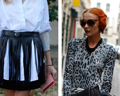 - Un cinturón de flecos actualiza el clásico conjunto camisa blanca y falda negra. Ese pelo naranja, otro detalle que destaca aún más el look junto al leopardo del jersey y las monturas carey de las gafas.